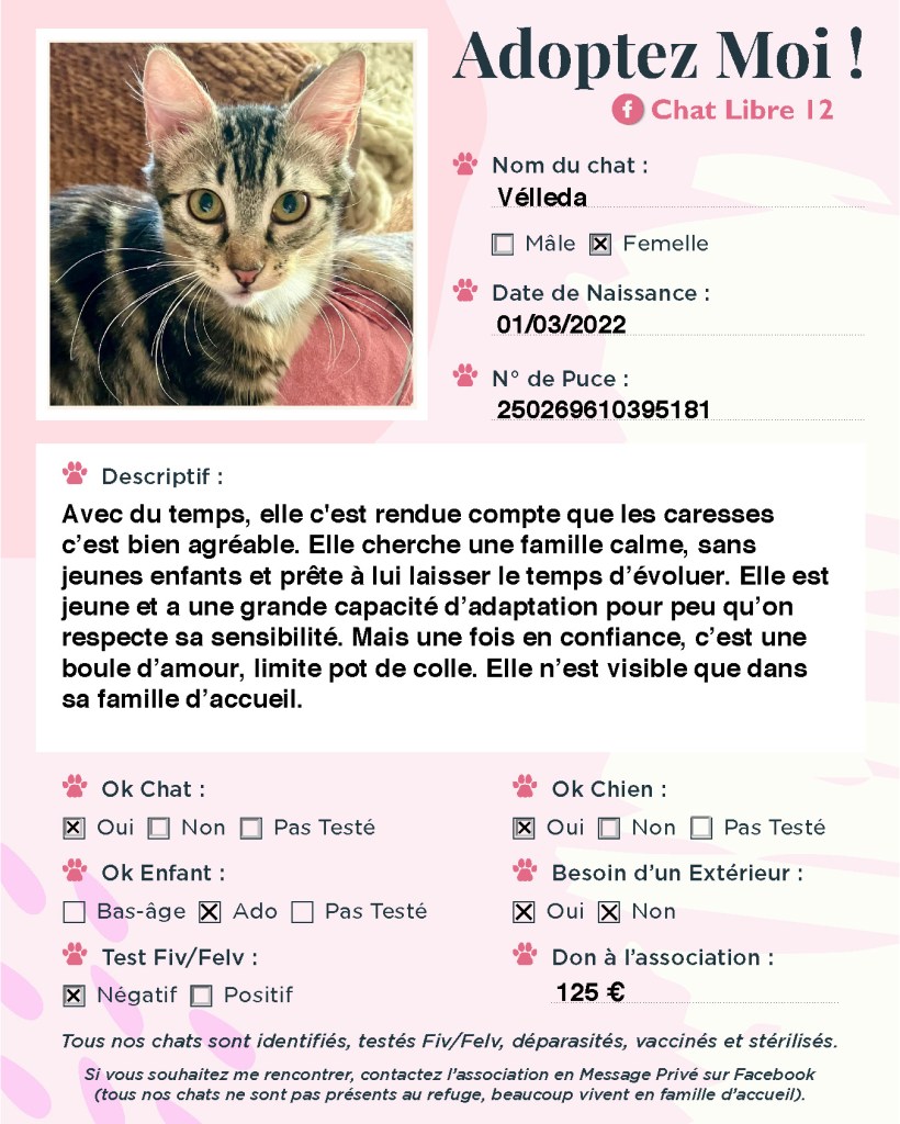 Velleda (adoptée) Publié parchatlibre1221 août 202221 janvier 2023Publié dansNos adoptés La participation aux frais pour l’adoption s’élève à 125€.