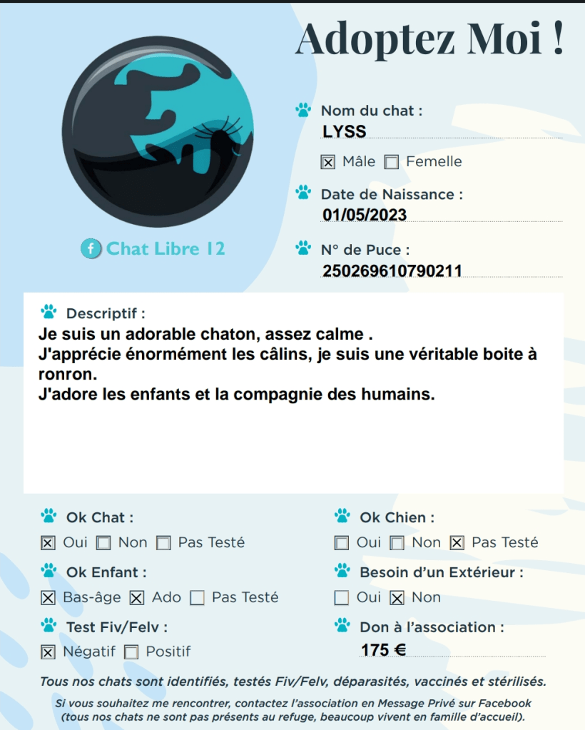 J’adhère à l’association Chat Libre 12