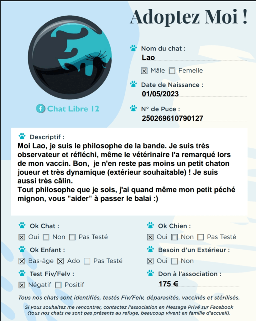 J’adhère à l’association Chat Libre 12