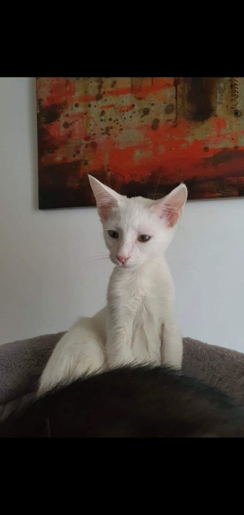 Mon 2eme prenom c’est trop mignon. Je suis plutôt calme et très câlin même si j’ai mes petits moments de folies. Ma couleur blanche ne me permet pas de sortir, le soleil me brulerais mes belles oreilles donc pour ma santé et les garder longtemps un bel appartement avec des jouets et calins me suffiront, je ne suis pas contre un copain chat.
