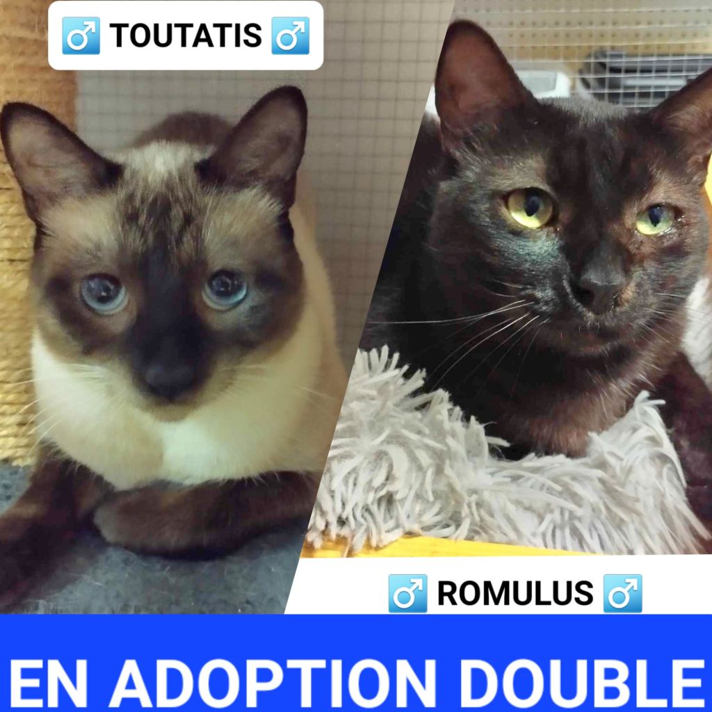 Toutatis est un peu timide au départ. Il faudra lui laisser le temps de s’ acclimater a son nouvel environnement et sa nouvelle famille. Une fois en confiance, c’est un chat espiègle, joueur et câlin. Il est inséparable de son copain d’infortune Romulus, adorable minou calme, câlin et joueur.