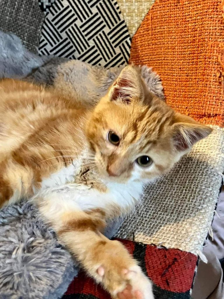 Plein de vie , il n’a pas trop le temps pour faire des câlins mais se met à ronronner dès qu’on le caresse .
